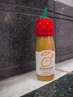 My sister had told me about this great company that does a fundraiser every year at Christmas time where they take little hats that have been knitted by hand and donated, and place them on the tops of their smoothie bottles. Money goes to a foundation to keep the elderly warm, well fed, and in good company throughout the holidays.